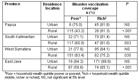 To investigate the relative importance of household wealth in urban and rural areas, the measles vaccination coverage rates for poor and wealthy children were compared in rural and urban areas of Papua, South Kalimantan, East Java and West Sumatera provinces. Papua, South Kalimantan and West Sumatera were selected because they have been identified since 2006 as priority areas for improving measles vaccination by the Indonesian Ministry of Health. East Java was chosen because this province has above average measles vaccination coverage.