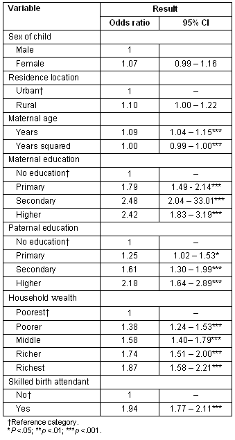 Multivariate logistic regression analysis was performed to assess the independent effect of rural-urban residence on measles vaccination coverage, while controlling for sex of the child, maternal age, maternal age squared, maternal and paternal education, household wealth and the presence of a skilled birth attendant.
