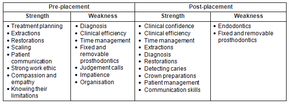 The students perceived the clinical strengths of the program to be treatment planning, being able to undertake extractions, good communication skills, and a strong work ethic (Table 1). Weaknesses across the group were reported as diagnostic skills, prosthodontic experience and poor organisational skills.