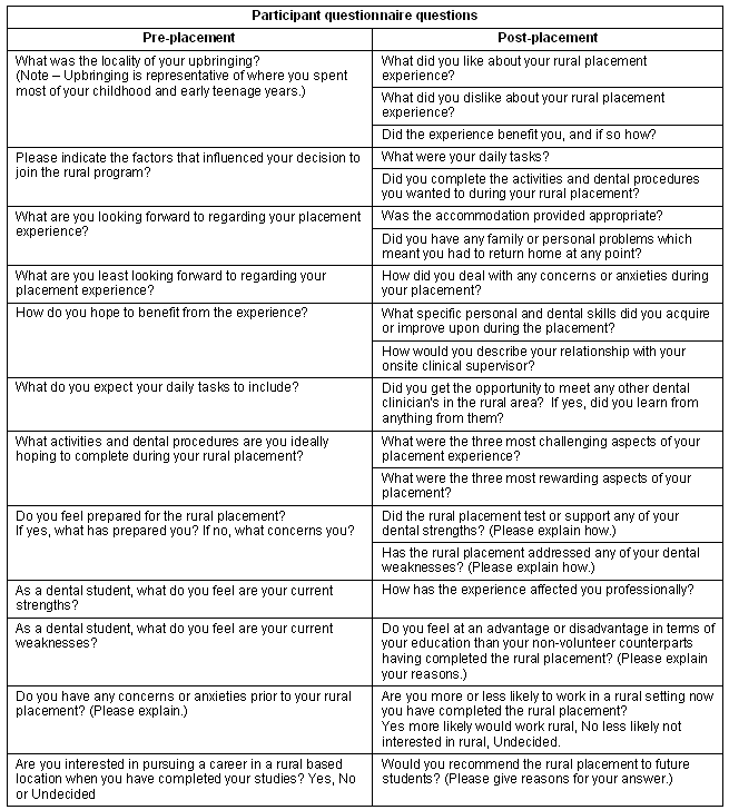 A semi-structured questionnaire with some open questions was used to record demographic data, rural background, opinions on clinical supervisors, clinical tasks plus students' expectations, concerns and anxieties about the rural initiative, and their future work intentions. The open questions gathered a considerable amount of data and 'framework analysis' was used to provide a platform for interrogation of these data. In order to assist with the content analysis, seven academic dentists identified themes in the questionnaires' open questions. Each staff member received a random selection of 4 pre- and post-placement questionnaires and was asked to identify common themes in those student responses. The themes were then collated by the two principal researchers (GJ and AB) and these formed the basis of the qualitative analysis (Fig1).