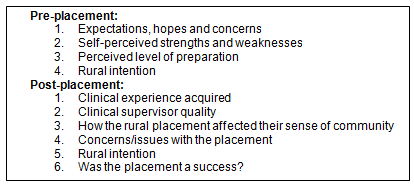 A self-completed questionnaire was distributed to the students 2 weeks prior to their rural rotation and a post-placement questionnaire within 10 days of their return. Students who did not respond were followed up via email, with a telephone call or SMS one week later.