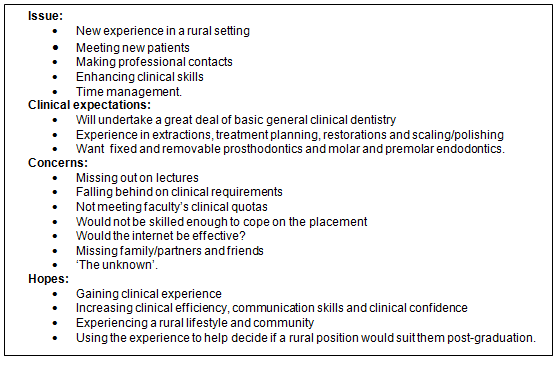An overview of the students' expectations, hopes and concerns prior to their rural placement is provided (Fig2). The most common expectations varied from 'a new experience', meeting different patients to gaining more clinical dentistry (including extractions, treatment planning and simple restorations). Students hoped to increase their clinical experience, improve their communication skills and gain confidence while experiencing a rural community lifestyle.