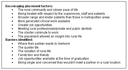 The Faculty of Dentistry, University of Sydney, New South Wales (NSW), implemented a Rural Placement Program with funding from the Australian Government Department of Health and Ageing. The placement program was modelled on those described by the Universities of Melbourne, Western Australia and Manchester11,12,16. The evaluation utilised self-complete questionnaires with a number of free-answer sections to record the students' views and opinions of the placement. This article focuses on the students' perspectives on the placement, with particular emphasis on factors and barriers which may have influenced their intentions to work in a rural location post-graduation.