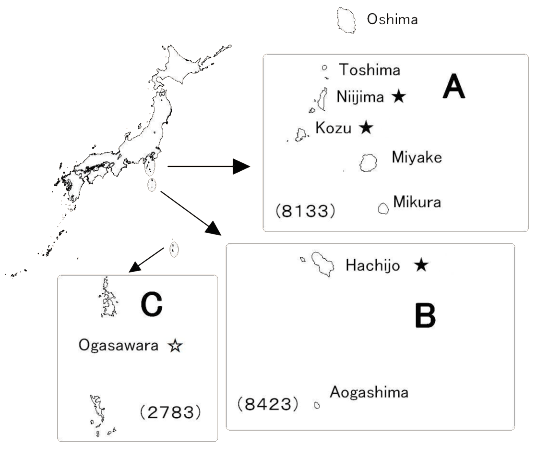), which is active at Kozu but inactive at Niijima and Hachijo. The white star (