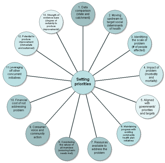 8. Considering the values of all members (ensuring all members of society have their basic needs met): When setting priorities, economic, policy and political factors are usually to the fore. However, the set of values held by agencies and community members, although rarely articulated, deeply underpins many of the debates about priorities. For example, should priorities focus on the group in greatest need, such as those who experience serious and multiple disadvantages? If so, the Socio-economic Indexes for Areas (SEIFA) Index30 enables the neediest communities to be identified down to neighbourhood, town or postcode level. Or should all members of society first have assured their basic needs for housing, food, access to affordable utilities, education, and employment before other needs are addressed? Should services be universally provided or selective or subsidised, or based on the principle of mutual obligation? What balance should be struck between the allocation of resources to health promotion and illness prevention, and to the treatment of diseases and injuries? Should those who knowingly take health risks have a lower priority for health services allocation? Values clarification is essential for focused, long-term planning.