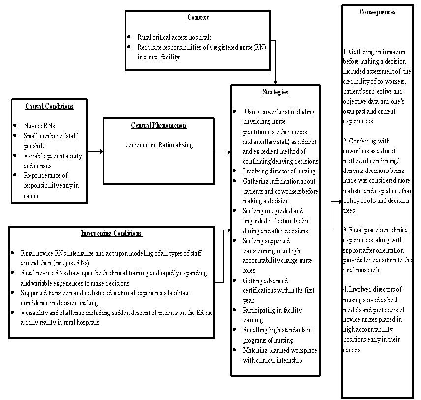 Figure 1: Axial Coding Paradigm. a conceptualization of the central phenomenon (sociocentric rationalizing) as it relates to clinical decision-making in the context of novice nurses in rural critical access hospitals35.