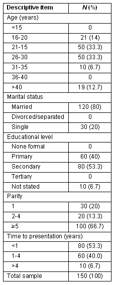 During the 12 months of the study 271 women had their VVF repaired at the Family Health Centre. Of these women, 265 gave informed consent and were recruited to the study. Only 150 women who had successful repair returned for follow up 6 months after repair and these comprised the study population.