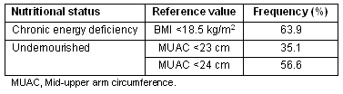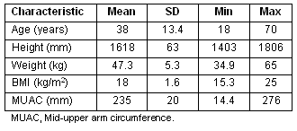 Mean and standard deviation (SD) of age and the anthropometric variables are presented (Table 1). The subjects were aged between 18 and 70 years with a mean (SD) age of 38 (13.4) years. The values for height, weight, BMI and MUAC were 1618 (63) mm, 47.3 (5.3) kg, 18.0 (1.6) and 235 (20) mm, respectively. Subjects' NS (based on BMI and MUAC) is provided (Table 2). The prevalence of CED (BMI <18.5) was 63.9% and under-nutrition (MUAC <230 mm) 35.1%.