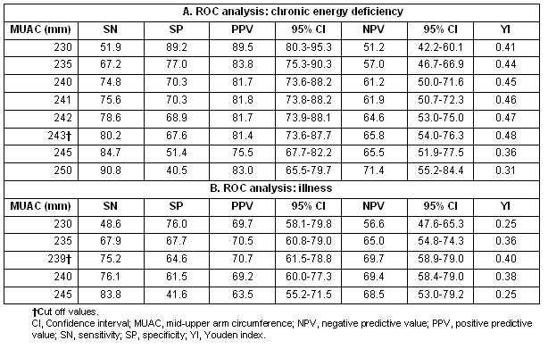 Table 4: Results of receiver operating characteristic curve analyses of mid-upper arm circumference with: (a) with chronic energy deficiency status; and (b) illness status (working days lost)