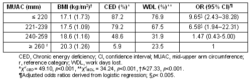 Table 5: Mean (standard deviation) BMI, prevalence of chronic energy deficiency and working day lost according to mid-upper arm circumference groups