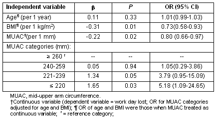Table 6: Logistic regression analysis of 'working day lost' on age, BMI and mid-upper arm circumference (separately as continuous and categorised)