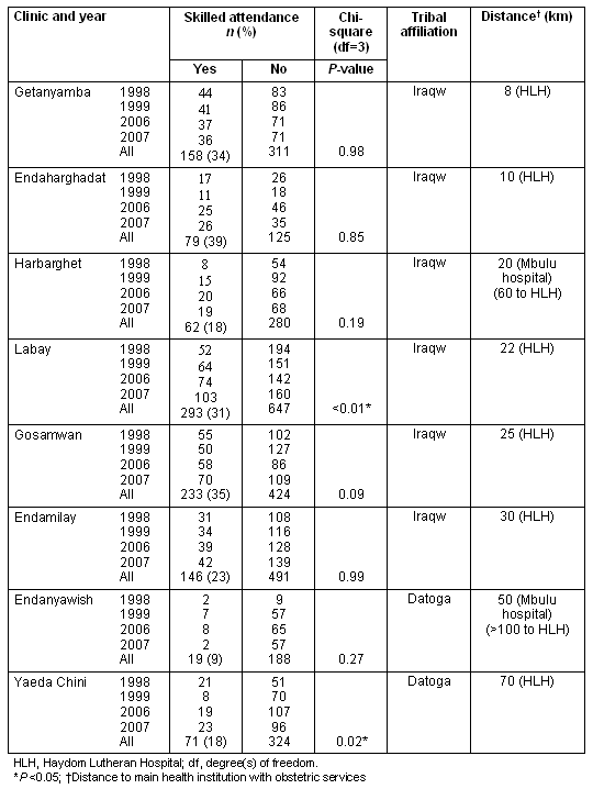 In the multivariate analysis, tribal affiliation in 2007 and for all years combined was the only remaining significant predictor. These results may reflect the fact that clinics that were mainly attended by Iraqw people and had low rates of skilled birth attendance for various reasons, were sometimes located close to health institutions with obstetric services (Harbarghet and Endamilay), thus diminishing the influence of tribal affiliation, especially in 1998 and 1999.