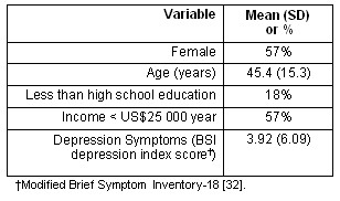 Depression symptoms: Self-reported symptoms of mental illness in the past year were assessed using a modified version of the Brief Symptom Inventory-18 (BSI-18)32. The BSI-18 has been demonstrated to have good internal consistency, with Cronbach's α = 0.89 and item-to-item correlations of 0.37-0.7033. For the current study, only 17 of the 18 questions were used because the question related to suicidal ideation was excluded (due to IRB concerns about non-clinician students asking participants about suicidal ideation over the telephone). To expand the time period for measured symptomology, the BSI-18 instructions were also modified by asking people to endorse whether they had experienced symptoms in the past year, rather than the past week. For the purposes of this study, the Depression Index score was computed according to the BSI-18 instructions, adjusting for the omission of one item32. Despite the modifications made to the measure, the scoring allows for the omission of one item per scale and the internal reliability of the Depression Index score was good (α = 0.84)30.