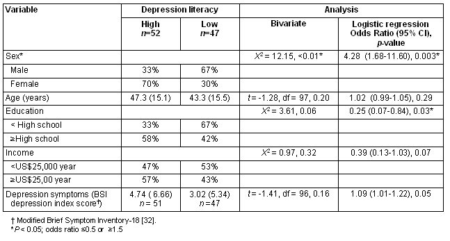 To better understand the relationship among these variables, a logistic regression analysis was conducted with age, sex, education (< high school) and income (< US$25,000/ year) as the independent variables and depression literacy as the dichotomous dependent variable. Results revealed sex (OR = 4.28, 95% CI = 1.68-11.60, p = 0.003), continued to have a significant relationship with depression literacy. Additionally, education had a significant relationship with depression literacy (OR = 0.25, 95% CI = 0.07-0.84, p = 0.03; Table 2) with those with less than a high school education being more likely to have low depression literacy.