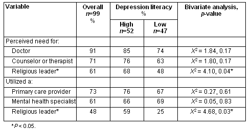 Next, the bivariate associations were explored between depression literacy and perceived need for and utilization of services for emotional problems (Table 3). There was not a statistically significant difference in the relationship of depression literacy and perceived need for a doctor or a counselor. There was a statistically significant relationship between depression literacy and perceived need for a religious leader with those with higher depression literacy being more likely to perceive a need for a religious leader and than those with low depression (Χ2 = 4.10, 0.04; Table 3). Results for utilization of services for emotional problems revealed that there was not a statistically significant relationship between depression literacy and utilization of a doctor or a mental health specialist for emotional problems. However, there was a statistically significant relationship among depression literacy and the utilization of a religious leader for an emotional problem (Χ2 = 4.68, 0.03). Those with high depression literacy were more likely to have sought help from a religious leader than those with low depression literacy (Table 3).