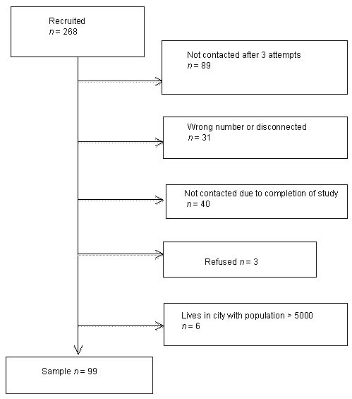 A total of 268 participants were recruited (34.8% male, 64.8% female), and of 39% (n = 105) were successfully contacted by telephone and agreed to participate (35% of the women and 46% of the men who were initially recruited: χ2 = 2.9, df = 1, p = 0.09). Due to difficulty recruiting men for the study and in order to have a representative sample, there was increased effort made to have recruited men complete the survey. Most of the participants lived in the counties that contained the grocery store they visited (87.3%); the remainder indicated they lived in neighboring counties. Some of those recruited were not contacted due to completion of data collection (n = 40). Three attempts were made to reach each participant by telephone and messages were left when possible. No further contact attempts were made for those who were not reached after 3 attempts (n = 89), for those recruited but declined to participate (n = 3), or for participants whose telephone number was incorrect or the number was disconnected (n = 31). Of the 105 people contacted who completed the interview (44% male); six were excluded from the sample because their reported zip (postal) code was for a city with a population more than 5500. Therefore, the total number of participants included in the final sample was 99, of which 43% were male (Fig1).