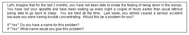 Depression literacy: Depression literacy was assessed with a vignette created by Rost et al25 that describes a person experiencing symptoms consistent with a major depressive episode (Fig2). The vignette was modified to direct address style but otherwise retained all essential elements of the story. The vignette was created to be used in both rural and urban samples and therefore was not modified to reflect a rural lifestyle. After the vignette was read to participants they were asked whether they thought the situation described in the vignette was a problem for them, and those who answered 'yes' were asked what they would call the problem.