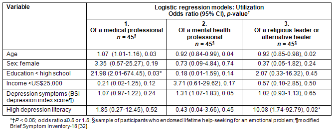 To test the second hypothesis that having higher depression literacy would predict utilization of a medical provider and specialty mental health provider but not a religious leader or alternative healer, a three logistic regression model was conducted predicting past utilization of a medical provider, specialty mental health provider and religious leader or alternative healer with common predictors of utilization (age, sex, income, depression symptoms and education) and depression literacy as predictor variables; Table 5). Results of the first regression equation revealed that participants with more education were more likely to utilize a medical professional for an emotional problem (OR = 21.98, CI = 2.01-674.45, p = 0.03). Contrary to the second hypothesis, depression literacy was not significantly associated with utilization of a medical provider. The results of the second regression equation revealed that none of the independent variables was a significant predictor of utilization of a specialty mental health provider for emotional problems (Table 5). Results of the third regression equation revealed that depression literacy (OR = 10.08, 95% CI = 1.74-92.79, p = 0.02) was a significant predictor of utilization of a religious leader or alternative healer for emotional problems (Table 5).