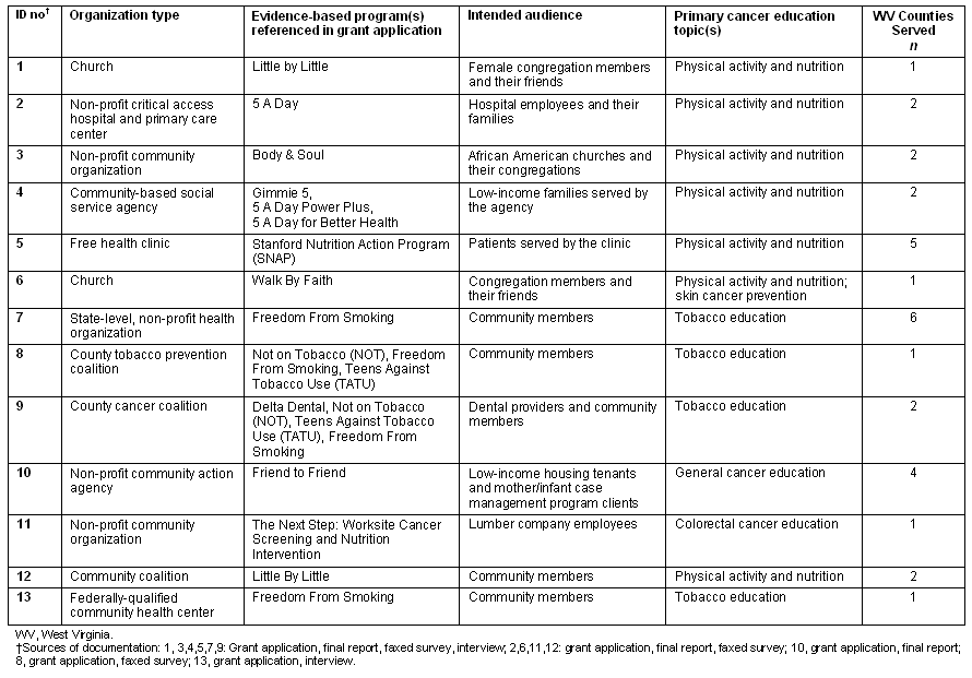 Thirteen grant applications were received and after undergoing a formal review, all 13 proposals were selected for funding. Each community organization was awarded $3,500 for program implementation starting 15 April-30 November 2007. Grantees collectively covered 30 West Virginia counties and included local coalitions, faith-based entities, non-profit community organizations, social service agencies, and health clinics (Table 1). Each grantee was asked to submit a final programmatic report at the end of the funding period.