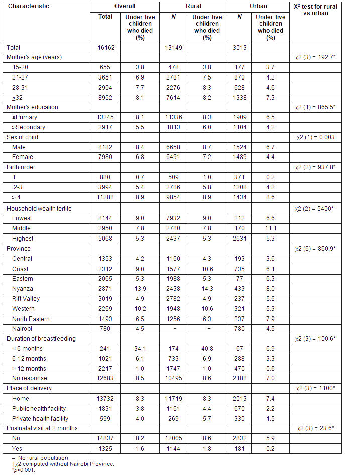 Among the deaths in rural areas, the proportion in households in the lowest wealth tertile was higher than in this category of households in the urban areas. High prevalence of under-five deaths was seen in the rural areas in the Coast, Nyanza and Western provinces, and in the urban areas of Nyanza Province. The prevalence of under-five deaths was higher in rural areas compared with urban areas when the child had been breastfed for less than 6 months, delivered at home, or not been taken for a postnatal check 2 months after birth.