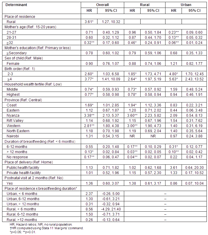 The results of the multivariate analysis of risk factors for under-five mortality in Kenya are shown (Table 2). In the model using the overall sample, place of residence was a significant (p<0.05) determinant of under-five mortality as seen in the hazard ratio of 3.6 for rural areas compared with urban areas.