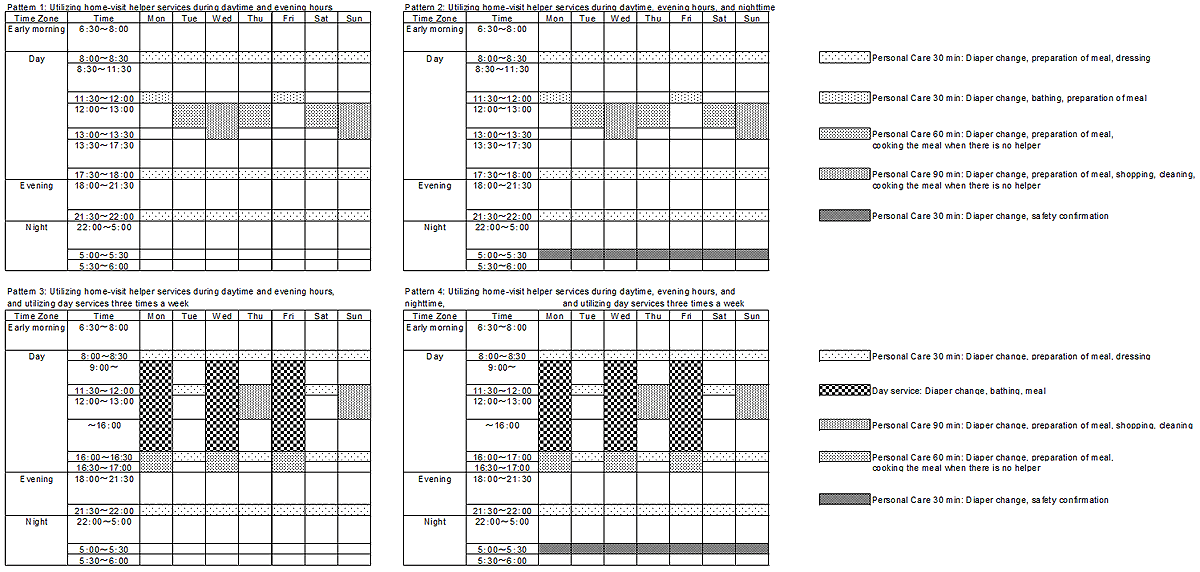 Consequently, four patterns of post-discharge home care plans were formulated for the selected participants. For the purpose of this study, four patterns were chosen that utilized home-visit helper services alone, or in combination with day services. The first pattern utilized home-visit helper services during the day and evening hours without utilization of day services. The second pattern utilized home-visit helper services during the day, evening hours, and night, without utilization of day services. The third pattern utilized home-visit helper services during the day in combination with day services three times a week. Finally, the fourth pattern utilized home-visit helper services during day, evening hours, and night, in combination with day services three times a week. Disabled elderly people living at home usually require home care services during the day and evening hours, but not so much during the night. Participants who required night care, such as aspiration or safety confirmation, were assigned to either the second or fourth pattern.