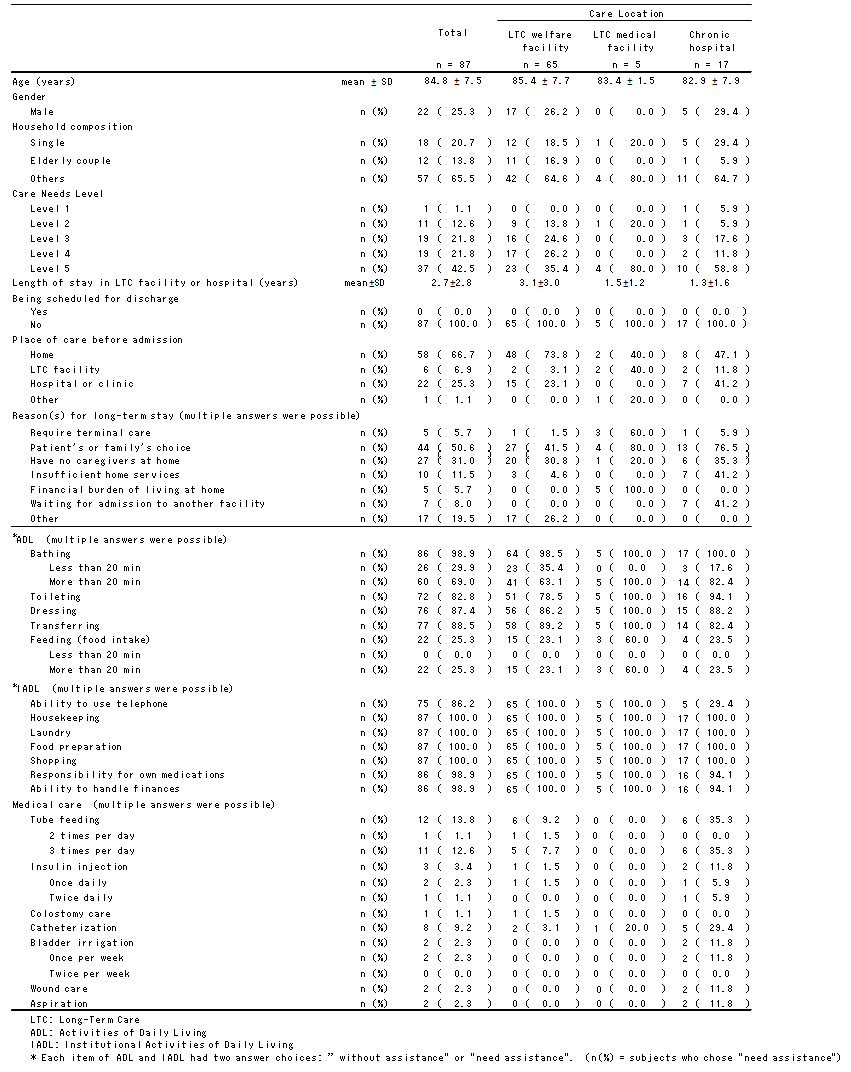 An original questionnaire survey was conducted among institutional staff to obtain information about basic demographics, Activities of Daily Living (ADL) and Instrumental Activities of Daily Living (IADL), and medical care. In addition, respondents were asked to predict potential issues at home regarding patients' behavioral problems should they be discharged to their homes. Each item of ADL, IADL, and medical care had two answer choices: 1 for 'without assistance', and 0 for 'need assistance'. For a response of 'need assistance', three additional questions were asked: (i) How many times a day/week? (ii) How long does it take? and (iii) How many personnel are required?