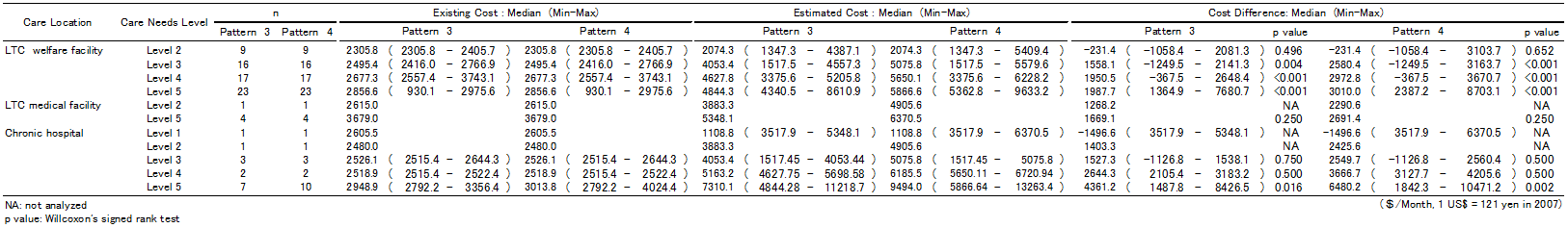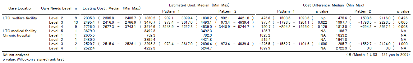 The existing costs were examined and estimated home care costs calculated assuming that participants would be discharged from institutions to their homes. Existing costs were expressed as median (min-max), and for each, a percentage was obtained. The estimated home care costs were then compared with the existing institutional costs through stratification of Care Needs Level and facility type using the Wilcoxon signed ranks test, and p<0.05 was considered statistically significant. Existing costs and estimated home care costs are presented using the exchange rate for 2007 (ie 121 yen to the dollar).