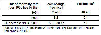 In the period 1994-2008, the infant mortality rate decreased by approximately 90% in Zamboanga, compared with a 50% national drop (Table 1). While further research is necessary to be able to assert causality in this association, that many of the other impacts mentioned above are significant social and medical determinants of this important health indicator lends weight to at least some credit being attributable to the creation and work of this innovative medical school.
