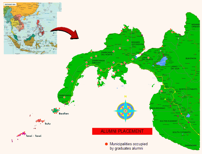 A 2011 review of School and student reports revealed the following outcomes. Between 15 and 35 students have been admitted to the School each year. The 164 graduates had a cumulative 90% pass rate at national licensing examinations. Over 90% of the graduates were still practicing in the Philippines, compared with the national average of 32%. Of these 90%, 85% were practicing in the Zamboanga region, with 50% in rural and remote areas. There continued to be a minimal in-flow of graduates from other medical schools to this region, despite national programs such as the 'Doctors to the Barios'. The location of graduates is shown (Fig1), and only 69% of municipalities were without medical care, compared with 80% in 1994.