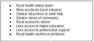 The definition of rurality is problematic. It is neither possible nor sensible to equate rurality in the UK with that in Australia, Canada and the USA, because the distances are dramatically different and populations differently distributed. A rural setting for medical education in Australia, Canada and the USA may serve a population of 300 000 (similar to that of a district general hospital in the UK), situated in a locality which would not be categorised as rural in the UK but may be 200-1000 km from the next such facility. Internationally, there is no consistency in how rurality is defined but there is a group of common themes in rural health and education (Fig 3)2. There are different models of rural medical schools; Keele is a 'de facto rural school' with a catchment area containing a 'substantial rural population'; however, its role is not specifically defined as rural3.