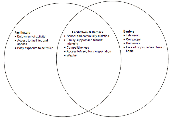 26. Moore JB, Jilcott SB, Shores KA, Evenson KR, Brownson RC, Novick LF. A qualitative examination of perceived barriers and facilitators of physical activity for urban and rural youth. Health Education Research 2010; 25(2): 355-367.