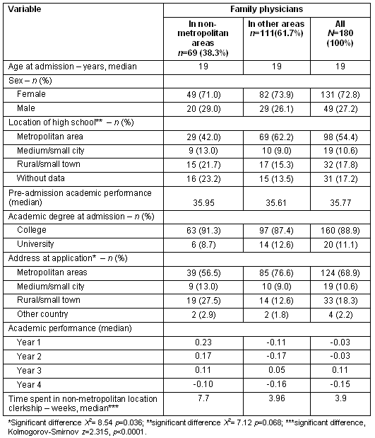 Descriptive data for the UdeS is provided (Table 1). Of the 180 FPs training between 1995 and 2006, 69 (38%) had established a practice in a non-metropolitan area 2 years after exiting residency. Family physicians established in non-metropolitan and in 'other' areas were similar for the majority of variables. A higher proportion of FPs practicing in non-metropolitan areas had a rural/small town address at the time of application to medical school (27.5%) compared with those practicing in other areas (12.6%; p=0.036). Similarly, a higher proportion of those practicing in non-metropolitan areas had attended a rural/small town high school as compared with those who were practicing in other areas (21.7% vs 15.3%, respectively; p=0.068). There was also a significant difference in the number of weeks FPs practicing in non-metropolitan areas had spent in non-metropolitan clerkships (p<0.0001, Kolmogorov Smirnov test). The median for those who had established a practice in a non-metropolitan location spent was 7.7 weeks in a non-metropolitan clerkship as compared with 3.9 weeks among those who were practicing in other areas.