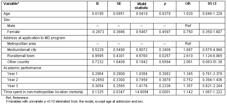 Table 3: Nature predictors of the location of practice in non-metropolitan areas for family physicians from Université de Sherbrooke (N=176), R2=0.101