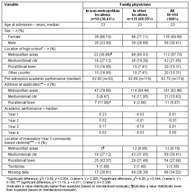 Individual characteristics in the analysis included sex; age at admission to the MD program; location of the high school (UBC) or the premedical college (UdeS); preadmission academic performance ('Cote de rendement global' for UdeS, overall undergraduate grade point average [GPA] for UBC); and the location of the student address in admission forms. The academic degree at admission to the MD Program was important to UdeS, given their provincial general and vocational education post-secondary educational program, a system exclusive to Quebec. Thus, degree at admission to the MD program was coded for UdeS (ie college/university). In BC, there is no comparable system, and this variable was not considered for the UBC analyses. Academic performance in each of the program years (ie years 1-4) was converted to a standardized score. High school/college and home addresses at admission were coded as: 1 = metropolitan area (municipality with 100 000 inhabitants or more), 2 = medium/small city (municipality with 10 000-99 999 inhabitants), 3 = rural/small town (municipality with <10 000 inhabitants) or 4 = country other than Canada27.