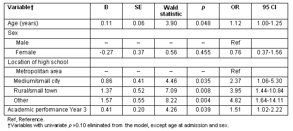 Univariate logistic regressions found three variables with significant associations to location of practice (p<0.05). The academic performance for years 1 and 2 also showed some statistical significance (p<0.10) in the association to location of practice (Table 2). Age at admission and sex were included in the multiple logistic regressions, along with these five variables. The model developed with the individual variables explained 10% of the variability (R2= 0.101, n=176, Table 3) while the model developed adding the program variable, the nurture predictor, explained 21% of the variability (R2=0.211, n=176; Table 4). For the nature plus nurture model, the single nurture variable (length of clerkship in a non-metropolitan area) was the most important predictor (OR=1.14, 95% CI: 1.067-1.22), the odds of establishing a practice in a non-metropolitan location increasing by 14% for each week of clerkship spent in non-metropolitan areas. Just one nature predictor had a significant effect: having an address in a rural/small-town environment at the time of application to the medical school increases more than twice the chances of practicing in a non-metropolitan area (OR=2.61, 95% CI: 1.24-6.06). This predictor conserves an independent and significant effect when the nature predictor is taken into account.