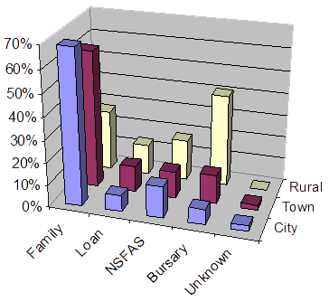 The source of funding for all 304 respondents is given (Fig1). Only 6 (27%) of the rural respondents were funded by their families, as opposed to 130 (69%) of the city respondents and 57 (61%) of the town respondents. Eighteen percent (n=4) of the rural students were funded by NSFAS loans (state-funded but disbursed by individual higher education institutions9) which are available to students once they are registered. The largest number of rural students (41%; n=9) was funded by bursaries from provincial departments of health or education. These bursaries required that graduates return to their area of origin to practice as dentists. Data from open-ended questions in the questionnaire indicated that not all rural students had access to provincial bursaries: 'The Province does not want to grant us bursaries'.