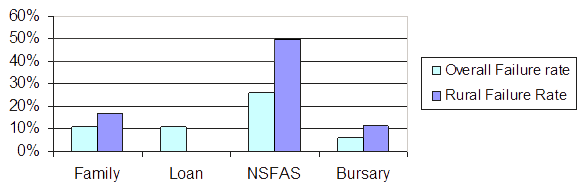 However, within the rural cohort, some students were academically more successful than others. The failure rate for rural students with NSFAS funding (50%; n=2) was higher than for rural students with provincial bursaries (11%; n=1). This difference may be attributed to the fact that provincial bursary students are selected on academic merit and are among the highest achieving rural school students. They have thus already demonstrated higher academic competence while at school than those who have to seek their own funding. However, this finding should be interpreted with caution due to the small numbers involved. The data, nevertheless, indicated that irrespective of area of origin, NSFAS students are more likely to repeat an academic year than students funded from other sources.
