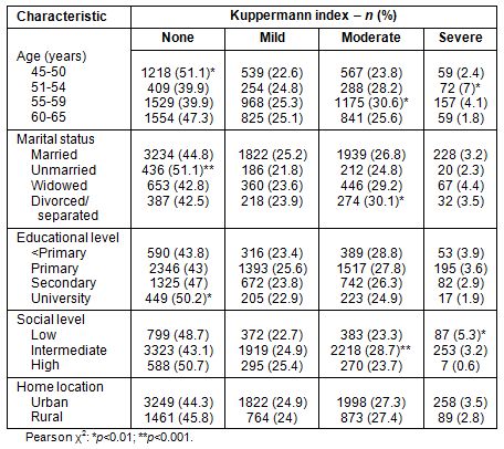 Symptoms were severe in 3.3% of the sample, moderate in 27.3%, mild in 24.6% and 44.8% had no symptoms. In the rural women symptoms were severe in 2.7% of the sample, moderate in 27.7%, mild in 24.7% and 44.9% had no symptoms, while in the urban environment they were severe in 3.7%, moderate in 27.6%, mild in 24.9% and 43.8% had no symptoms. Rural women had statistically significantly (p<0.01) fewer symptoms. The distribution of menopausal symptom intensity is shown according to age, marital status, home location, educational level and social status (Table 5).