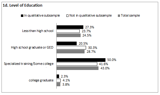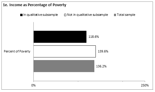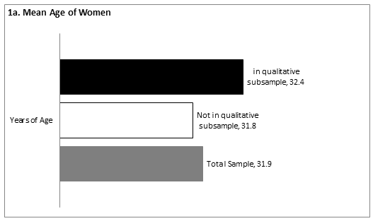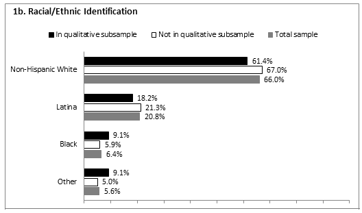 Demographics: The demographic data reported below represent the participants providing complete quantitative year 3 data (N=271). Appropriate analytic techniques (eg χ2 for categorical and t-tests for continuous variables) were applied to test for statistically significant differences between the participants included in the qualitative sub-sample (n=44) and the wave 3 participants not included in the qualitative sub-sample (n=227). Comparisons between these two groups are provided (Fig1) with statistically significant differences indicated where present. As a whole, the average age of participants at wave 3 was 31.9 years (SD=7.7). Almost two-thirds identified as non-Hispanic White (66%), followed by 20.8% Latina, 6.4% Black, and 5.6% other. The majority of participants was married (46.5%) or living with a partner (17.0%), while less than half were single (19.2%), divorced (11.1%) or separated (6.3%). A quarter of participants had less than high school education with 7.9% reporting an education level of 8th grade or less and 16.6% reporting some high school. Over a quarter had earned her high school diploma or General Education Development Test (GED; 28.7%). More than 4 out of 10 participants (43.0%) reported training beyond high school in the form of specialized technical, business, or vocational training (15.5%) or some college (27.5%). The remaining 3.8% were college graduates. On average, participants reported a household income at 136.2% of the federal poverty line (sd=93.04). Comparisons between the participants included in the qualitative sub-sample and those who were not yielded no statistically significant differences between the two groups on the above demographic characteristics.