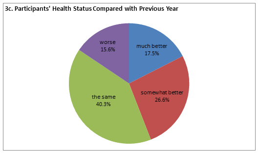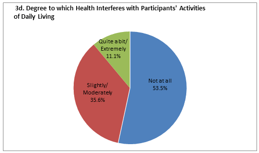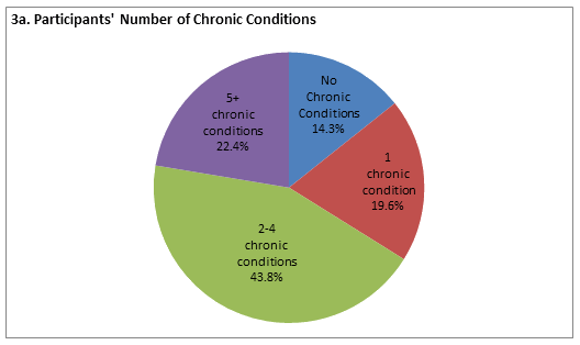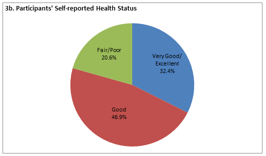 Health conditions: Summary statistics for health status among the participant families are presented (Fig3). The majority of participants (85.7%) reported having at least 1 chronic health condition (range 0-15); 43.8% reported managing 2-4 chronic conditions and 22.4% reported managing 5-15 chronic conditions. Interestingly, despite the high number of self-reported chronic health problems, 32.4% stated their health was 'very good' or 'excellent', and 46.9% stated their health was 'good', while 20.6% stated their health was 'fair' or 'poor'. The majority of participants (55.9%) did not perceive health to have improved over time with more than half rating their health as 'the same' (40.3%) or 'worse' (15.6%). Only 17.5% of participants reported their health was 'much better' than the previous year, while 26.6% of participants rated their health as 'somewhat better' than the year before. When asked to what extent their health has interfered with ADL, 53.3% reported 'not at all,' while 11.1% responded 'quite a bit' or 'extremely', and 35.6% reported 'slightly' or 'moderately'. The quantitative findings suggesting health did not improve over time are hypothesized to contribute to a lack of engagement in health management, a theme identified in the qualitative data.