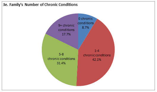Participants managed multiple health issues within their families. The majority of families (71.1%) had at least 2 family members with a chronic condition. Among partners, 41.9% had at least one chronic health condition (rage 0-8). Over half of the participants (56.6%) reported having at least one child with at least one chronic health condition (range 0-5). Of these, 35.3% reported having 2 children with a chronic health problem and 8.0% had 3 children with a chronic condition. The median number of chronic health conditions within a family was 4 (range 0-27). Examining the family as a unit, 42.1% reported 1-4 conditions, 31.4% reported 5-8 conditions, and 17.7% reported 9 or more conditions within the family.