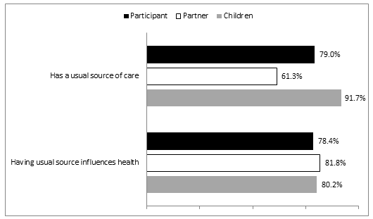 Respondents also recognized the value of having a usual source of care with 78.4% of participants reporting that seeing a regular doctor influences their own health; 81.8% reporting it influenced their partner's health; and 80.2% reporting it influenced their children's health.