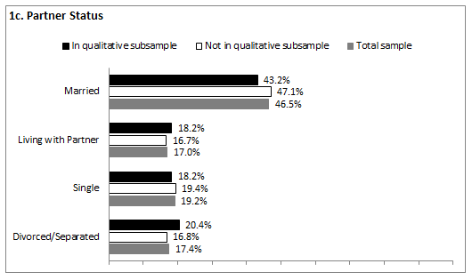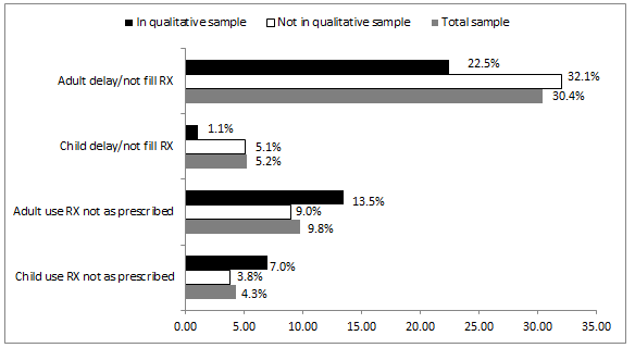Medication adherence: The summary statistics on medication adherence for adults and children in the participant households are shown (Fig2). There were no statistically significant differences on any of these variables between the total sample and the qualitative sub-sample. Among all adults (women and partners) in the total sample, 30.4% reported delaying or not filling medications prescribed by a healthcare provider. The prevalence was 22.5% in the qualitative sub-sample. For all children in the total sample, 5.2% of parents reported delaying or not filling prescription medications; in the sub-sample the rate was 1.1%. Regarding use of medication differently than prescribed, 9.8% of the participants/partners in the total sample reported 'yes', and 13.5% of the qualitative sub-sample reported 'yes'. Compared with adults, the prevalence of using medication differently than prescribed was lower for children in both the total sample (4.3%) and qualitative sub-sample (7.0%).