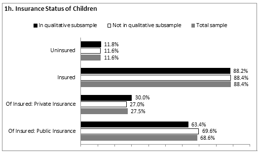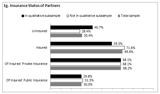 As a whole, there was a 29.1% healthcare uninsurance rate among women in the sample. The qualitative sub-sample did not significantly differ from those not included in the sub-sample. Within the qualitative sub-sample, 31.8% were uninsured, 34.1% were privately insured, and 34.1% were publicly insured. Similarly, among those not included in the sub-sample, 28.5% were uninsured, 29.0% were privately insured, and 40.7% were publicly insured (Fig1f). Within the total sample, of those who were insured, 33.0% had private insurance, 64.2% had public insurance (eg Medicaid, state plan), and 2.8% had other insurance. Among partners, there was a 30.4% healthcare uninsurance rate, with 40.7% of partners of participants included in the qualitative sub-sample lacking insurance compared with 28.4% of other partners (Fig1g). These differences were not statistically significant. Of the insured partners, 68.2% had private insurance, 30.0% had public insurance, and 1.8%% had other insurance. Among children, the uninsurance rate was 11.6% with 68.6% of insured children on public insurance (Fig1h).