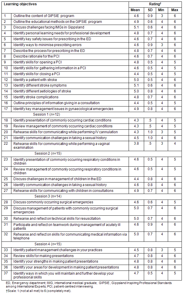 This research focused on commonly occurring clinical events to support participants in their everyday practice. Issues known to be challenging for IMGs were identified and explored. Content was developed in conjunction with local physicians, surgeons, emergency physicians and paediatricians. Additionally, the program drew on the Australian Curriculum Framework for Junior Doctors26 and was aligned with material offered by the Postgraduate Medical Council of Victoria (PMCV)27. A summarised version of content is listed (Fig1); while participants' ratings of the learning objectives are given (Table 1), as are their ratings of the educational methods (Table 2). Further information is available on the GIPSIE website.