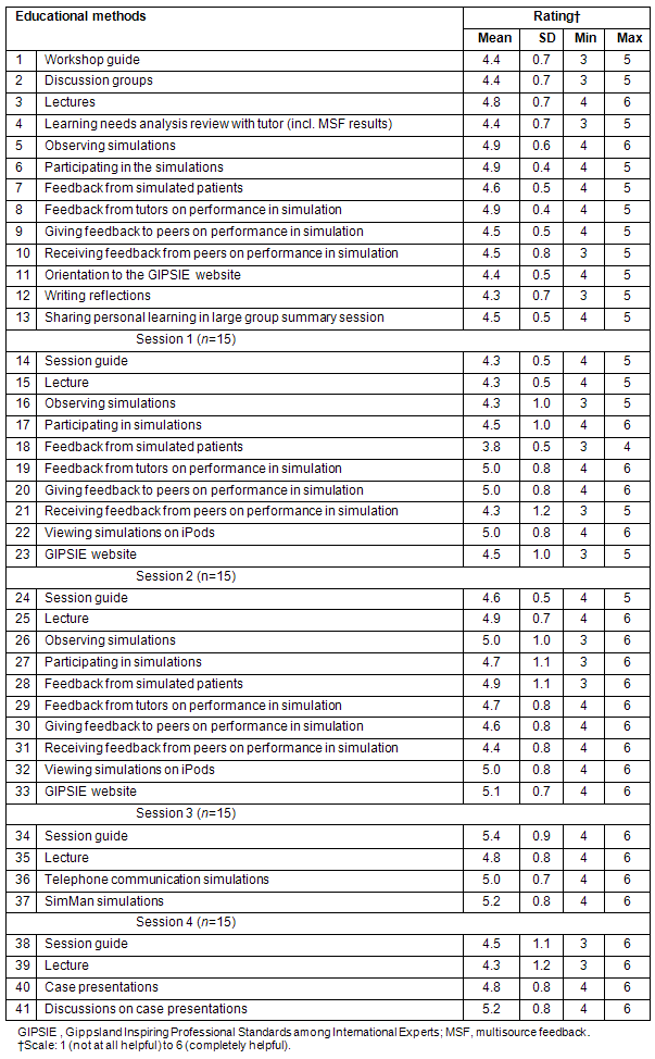 Educational methods: A summary of participants' ratings of the value of educational methods in supporting them to meet learning objectives is provided (Table 2). Participants' ratings were between 4.3 and 5.3 (SD 0.4-1.1; maximum score=6). Mean ratings fell within a narrow band. Scores that equalled or exceeded 5.0 were: