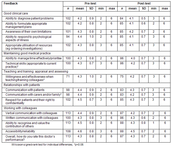 Multisource feedback (pre- and post-program): Based on an MSF form used in the UK for junior doctors, the IMG nominated colleagues to make judgments on facets of clinical practice. A six-point scale recorded level of competence. Participants were also asked to self-assess using this form, so they could start to construct a picture of how they see themselves compared with the perceptions of others.