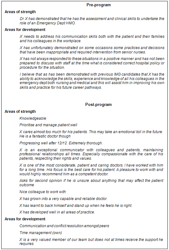 Pre-program, MSF free text comments proved especially valuable in identifying participants' strengths. Examples include willingness and enthusiasm to learn, ability to communicate with colleagues, diligence and an ability to work hard. Specific elements of behaviours that were reported to need development included communication with patients, their families and colleagues, English language (including heavily accented English), planning and organising care, documentation, selecting appropriate tests, clinical knowledge, adherence to hospital protocols and improving confidence.