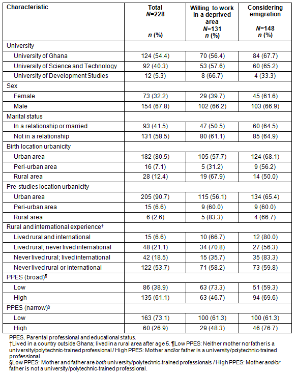 There was a sub-set of 80 individuals (35%) who reported being both willing to work in a deprived area in Ghana and considering emigration. This group contained more men than women (41% vs 23%), but there were no other major differences in their covariates (data not shown).